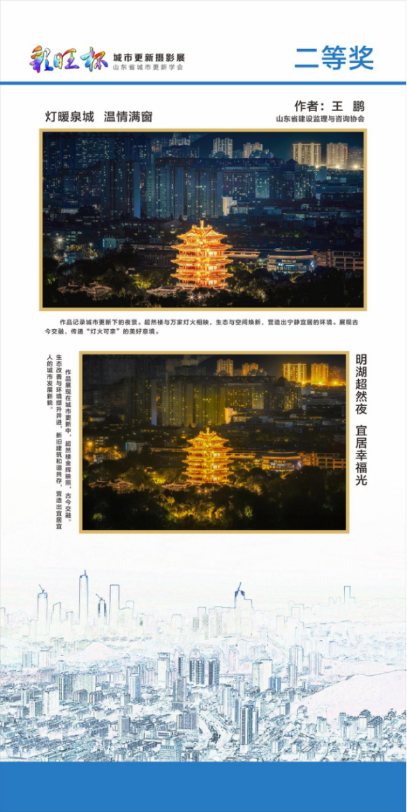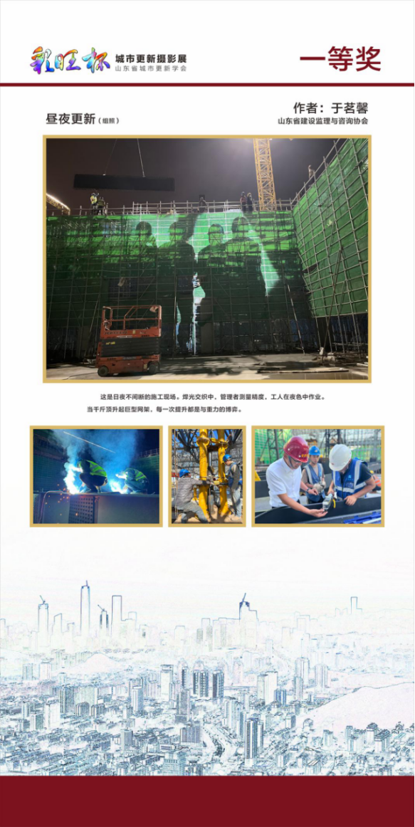 本次攝影展作品征集范圍覆蓋山東省域,聚焦城市更新六大維度:蝶變新生、匠心營造、文脈傳承、活力煥發(fā)、宜居樂享、共建共享。公司員工以工作一線為創(chuàng)作源泉,用鏡頭捕捉了一線工作者辛勤勞作、老舊小區(qū)改造、歷史街區(qū)保護(hù)、智慧社區(qū)建設(shè)等場景,展現(xiàn)了城市更新從規(guī)劃到落地的全過程。其中,一等獎(jiǎng)作品《晝夜更新》通過監(jiān)理人第一視角,生動呈現(xiàn)了建設(shè)者們?nèi)找共婚g斷的施工現(xiàn)場。焊光交織中,管理者測量精度,工人在夜色中作業(yè)。當(dāng)千斤頂升起巨型網(wǎng)架,每一次提升都是與重力的博弈;二等獎(jiǎng)作品《燈滿泉城,溫馨滿窗》則展現(xiàn)在城市更新中,超然樓金輝映照,古今交融生態(tài)改善與環(huán)境提升并進(jìn),新舊建筑和諧共存,營造出宜居宜人的城市發(fā)展新貌。