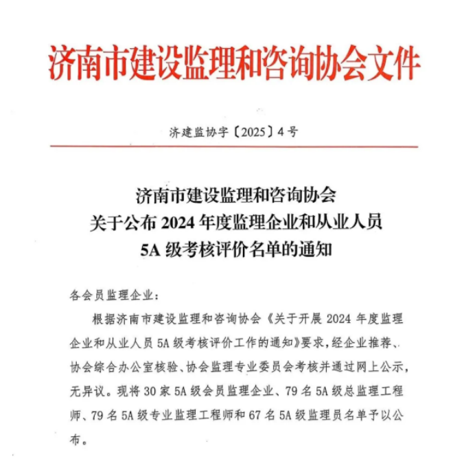 近日,濟(jì)南市建設(shè)監(jiān)理和咨詢協(xié)會(huì)正式印發(fā)《關(guān)于公布 2024 年度監(jiān)理企業(yè)和從業(yè)人員 5A 級(jí)考核評(píng)價(jià)名單的通知》(濟(jì)建監(jiān)協(xié)字〔2025〕4 號(hào)),經(jīng)過(guò)企業(yè)推薦、協(xié)會(huì)核驗(yàn)、專業(yè)委員會(huì)考核及全網(wǎng)公示等多輪嚴(yán)格評(píng)審,山東省建設(shè)監(jiān)理咨詢有限公司憑借卓越的綜合實(shí)力成功入選 5A 級(jí)會(huì)員監(jiān)理企業(yè)名單,與此同時(shí),公司 10 名核心從業(yè)人員分別斬獲 5A 級(jí)總監(jiān)理工程師、專業(yè)監(jiān)理工程師及監(jiān)理員殊榮,企業(yè)與個(gè)人獎(jiǎng)項(xiàng)的雙重突破,彰顯了行業(yè)對(duì)我司專業(yè)能力與服務(wù)品質(zhì)的高度認(rèn)可。?
